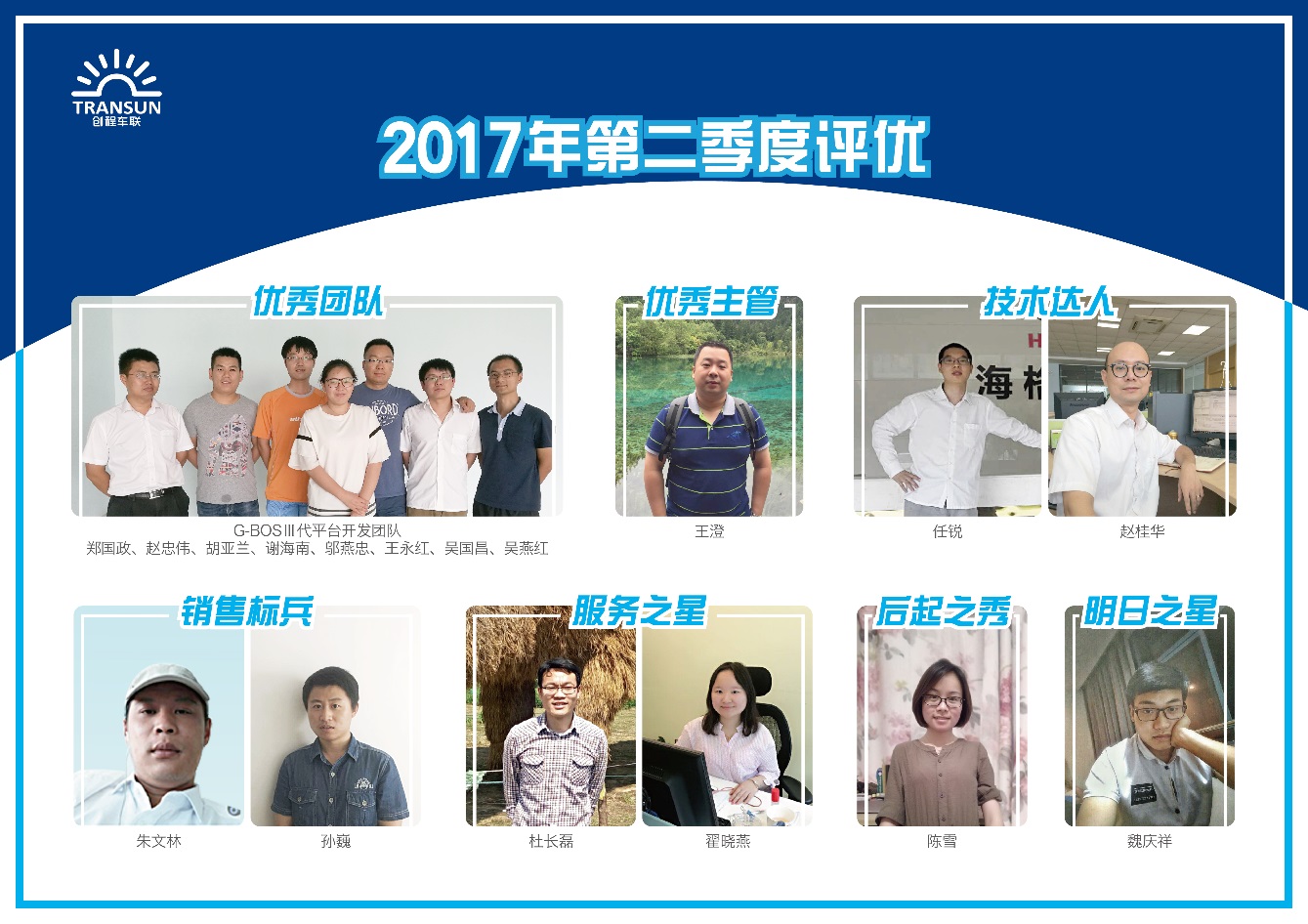 7月31号,第二季度优秀员工评选活动已圆满落下帷幕,经过一轮轮的筛选,一批优秀员工登上了光荣榜:优秀团队G-BOSⅢ代平台开发团队、优秀主管王澄、技术达人任锐和赵桂华、销售标兵朱文林和孙巍、服务之星杜长磊和翟晓燕、后起之秀陈雪、明日之星魏庆祥,在此,我们一睹他们的风采。