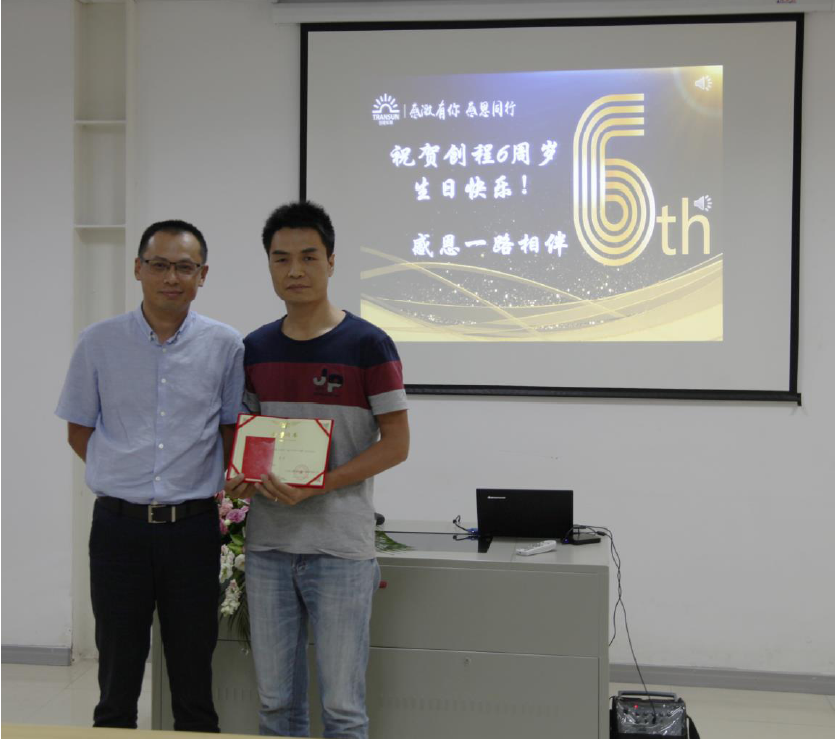 紧接着,活动进入了“资深员工授章”环节。创程的今天离不开每一个创程人的努力付出。他们用自己的青春,伴着创程一起成长。在创程六周年这个特别的日子里,特甄选了入职三周年、四周年、五周年的资深员工共计37名,公司专门为这些多年与创程同舟共济、不离不弃的员工颁发了精致的徽章,激励每一位为创程默默付出的员工。今后每年的9月13日,公司都将为入职达到年限的员工颁发荣誉徽章。